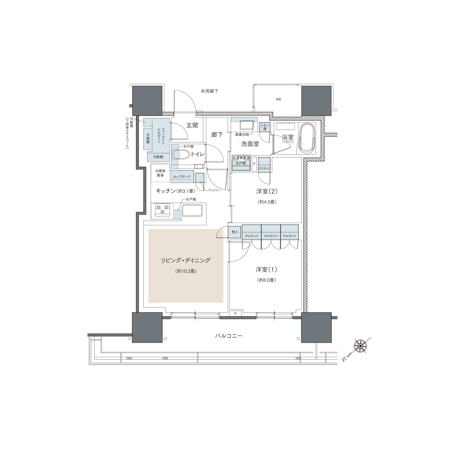◎大型シューズインクロゼットや洋室(1)の3連クロゼット、 物入れなどで収納力を確保 ◎家族の顔を見ながら料理ができる対面式キッチン ◎洋室(2)は空間を有効活用でき使い勝手のよい引き戸を採用