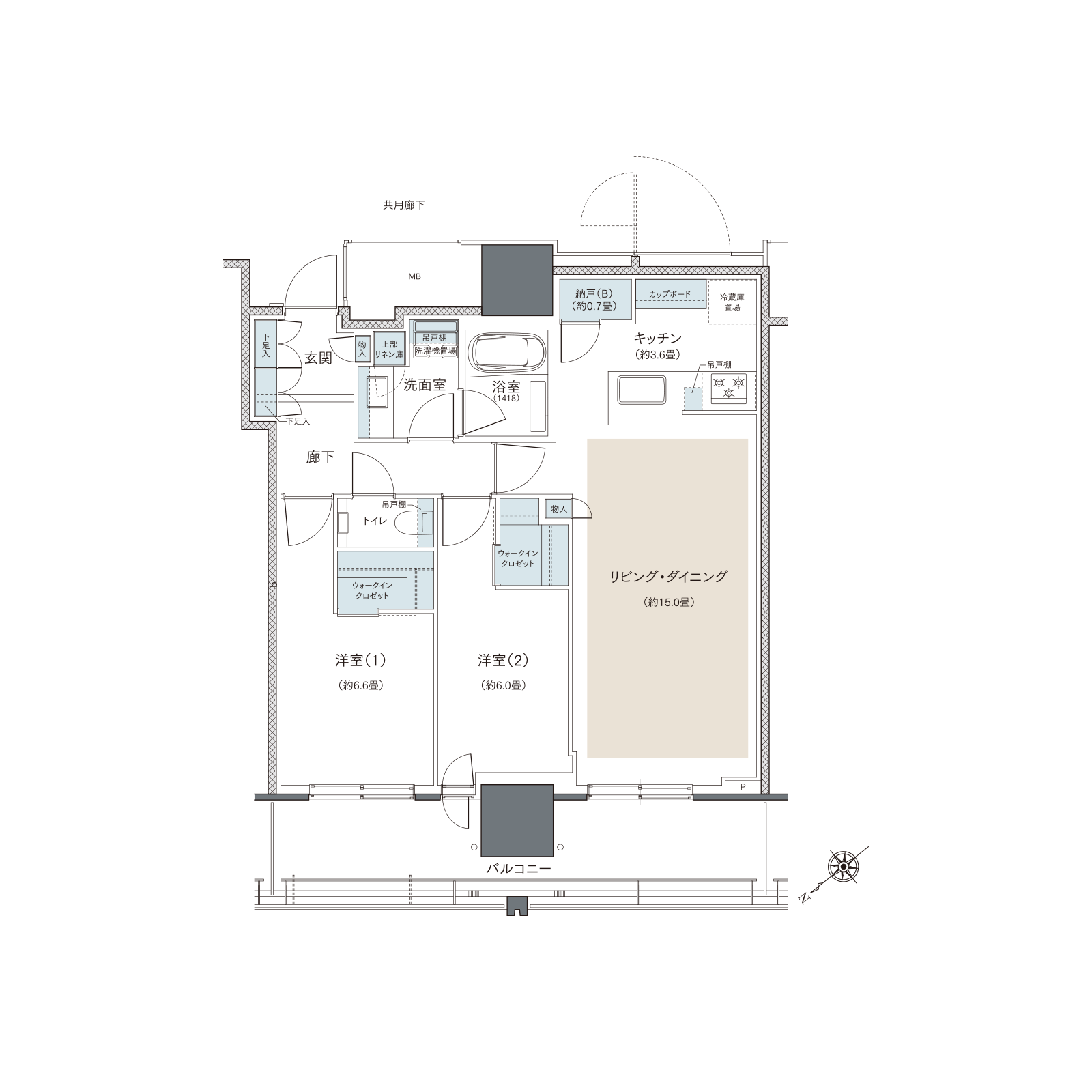 ◎リビング・ダイニングと一体的に使える対面式キッチン ◎居住性や開放感を高める全洋室バルコニーに面した設計 ◎全洋室にウォークインクロゼット、キッチンに納戸を備えて収納量を確保